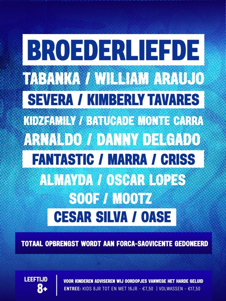 Bezoekers kunnen genieten van liveoptredens van Broederliefde, Tabanka, William Araujo, Severa, Kimberly Tavares en Kidzfamily. Ook Batucade Monte Carra ontbreekt niet: hun meeslepende ritmes zorgen voor extra energie en feestelijke sfeer.